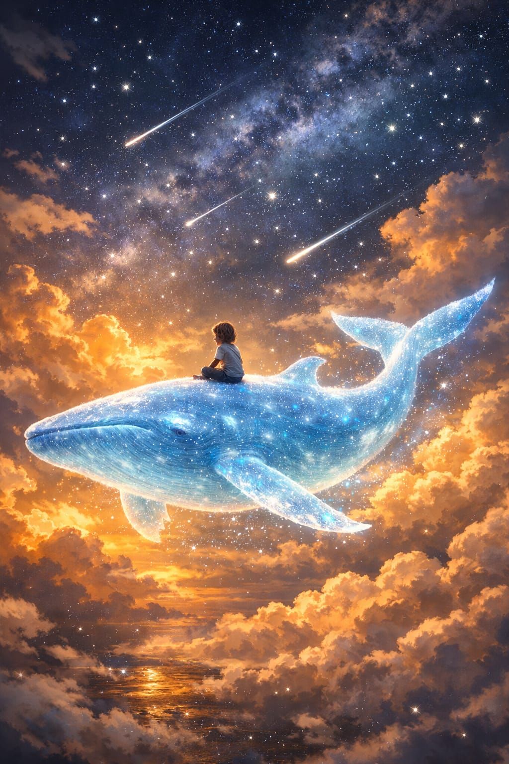 A child rides a shimmering blue whale of light through golden clouds under a starry twilight sky. This magical realism digital art features cinematic lighting and vibrant colors.