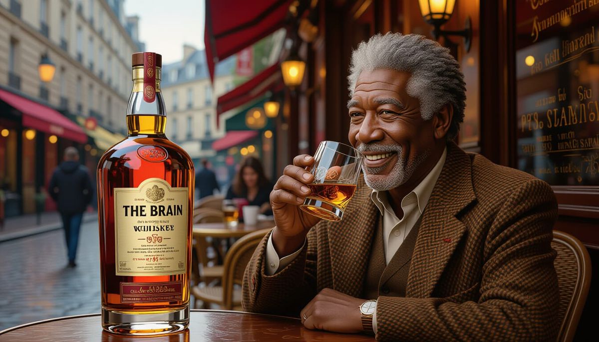 This hyperrealistic concept art shows a smiling Morgan Freeman at a vintage Parisian cafe, enjoying a drink. A detailed whisky bottle features his likeness with a unique inscription, under dramatic, colorful lighting.