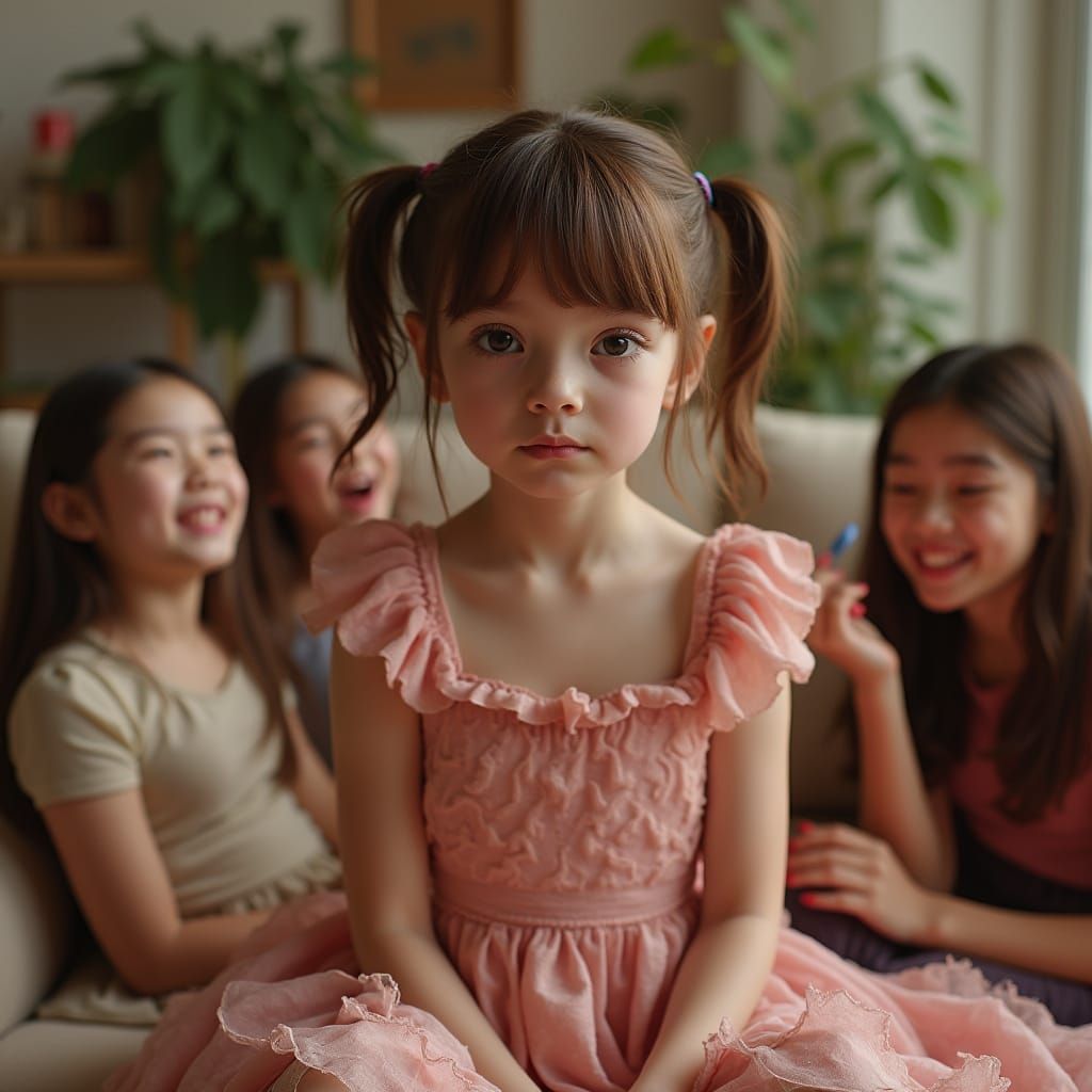 This image depicts a tender moment of a teenage boy surrounded by three laughing girls in a warm and inviting living room setting, adorned with soft decorations and lush indoor plants.