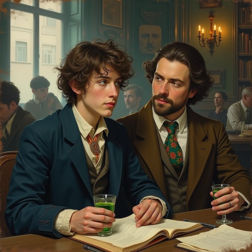 This image shows Rimbaud reciting poetry in a smoky absinthe den in 1871 Paris, observed by Verlaine. It captures the chaotic energy of artistic rebellion in a style reminiscent of Toulouse-Lautrec.