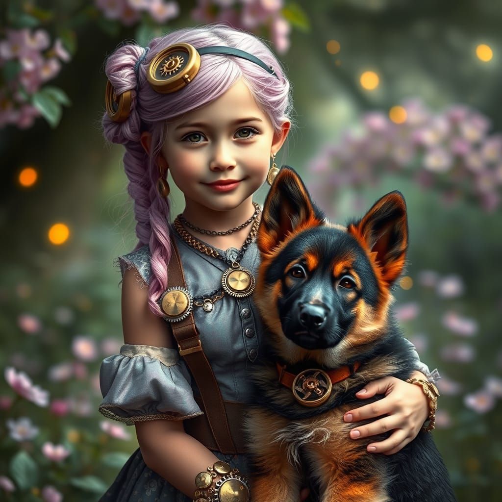 A captivating portrait photograph of a young girl immersed in a fantastical garden with her German Shepherd puppy. She is adorned in intricate steampunk attire, featuring brass gears and shimmering iridescent fabrics, with long, flowing hair a blend of lavender and soft pink cascading around her shoulders. ...