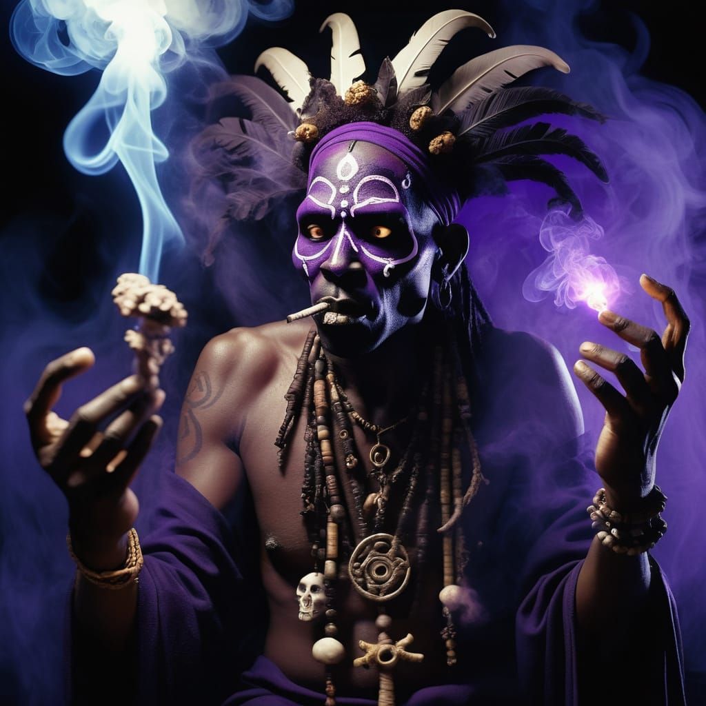 This dark fantasy illustration shows a witch doctor conducting a ritual with glowing symbols and ethereal smoke. The scene features ancient artifacts under dramatic, deep purple lighting.