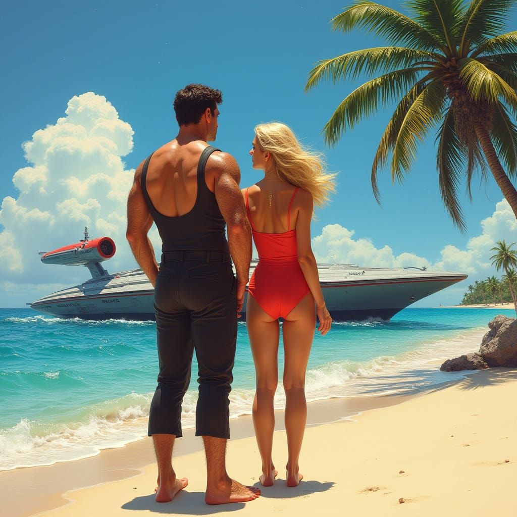 This image shows two Starfleet captains, Chakotay and Janeway, in a colorful, dreamy landscape, reminiscent of Gauguin's sun-drenched scenes, with a sense of adventure and freedom, as they stand beside their ship, USS Voyager, on a tropical beach