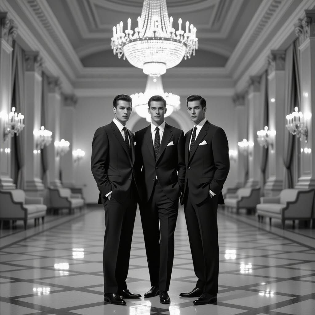 This image shows men in 1950s fashion posing in a ballroom. The black and white photograph captures the intricate details of tailored suits and elegant decor with classic sophistication.