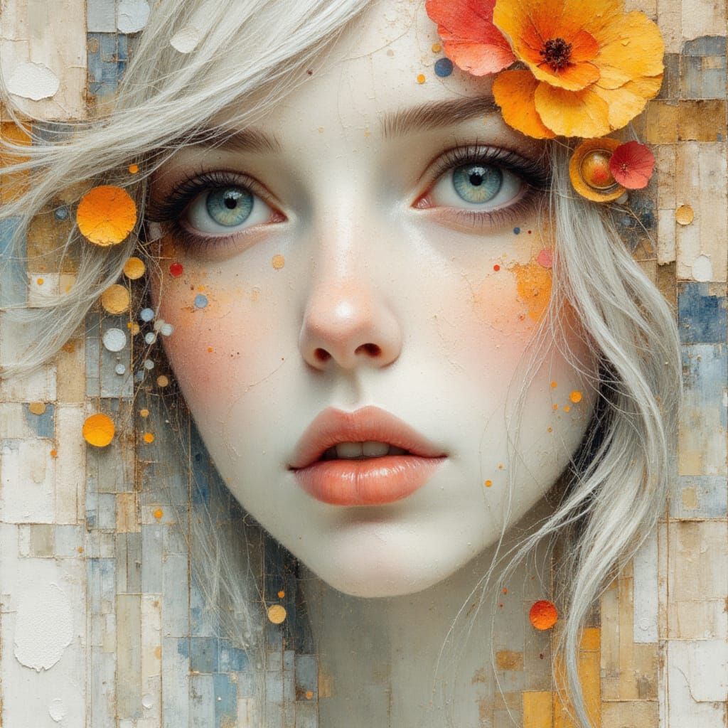 This image features a close-up portrait of a beautiful young woman with silver hair, rendered in a fantastical collage style with earthy colors and ethereal lighting. Her expression is serene and contemplative.