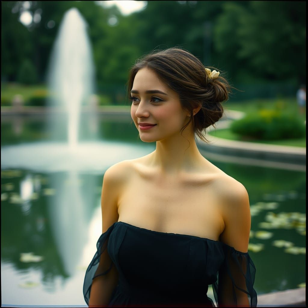 This image is a cinematic still of a woman in a contemplative mood, surrounded by the peaceful atmosphere of a serene pond, with a focus on film grain and cinematic lighting.