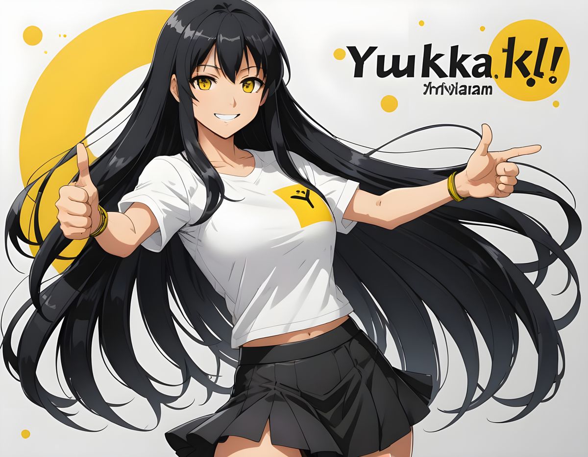 A digital anime-style portrait of a woman with long black hair and yellow eyes, giving a thumbs up. She is wearing a white top over a black bikini and skirt and a logo is visible.