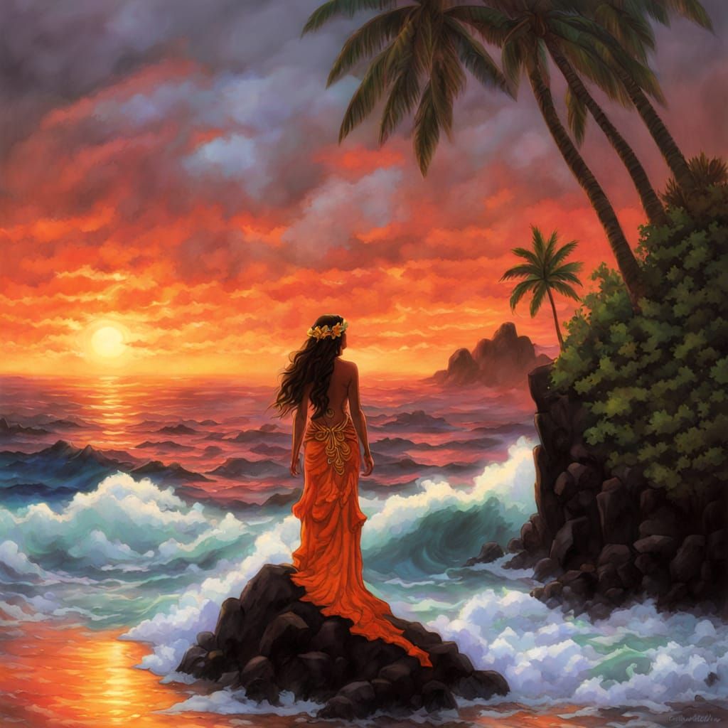 Concept art of a lone Hawaiian goddess on a windswept cliff, silhouetted against a fiery sunset. Dramatic digital painting with epic, cinematic fantasy art style.
