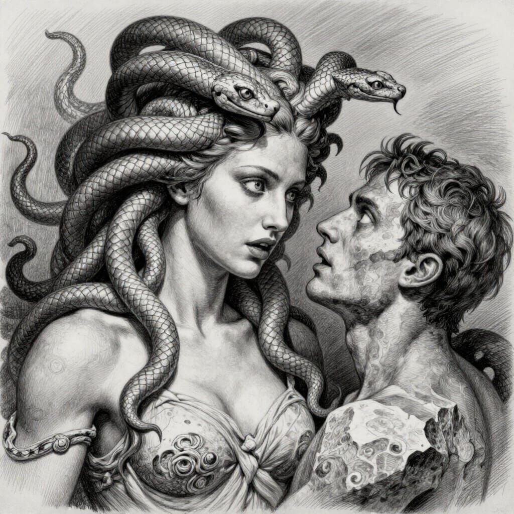 This detailed drawing captures Medusa turning a man to stone with her snake-hair writhing. Rendered with intense cross-hatching and dramatic chiaroscuro lighting, emphasizing horror and transformation.