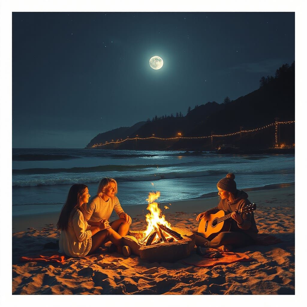 A serene night beach scene featuring four figures around a campfire, one playing guitar. Gentle waves meet the shore under a starlit sky, with a distant Ferris wheel in an impressionistic style.