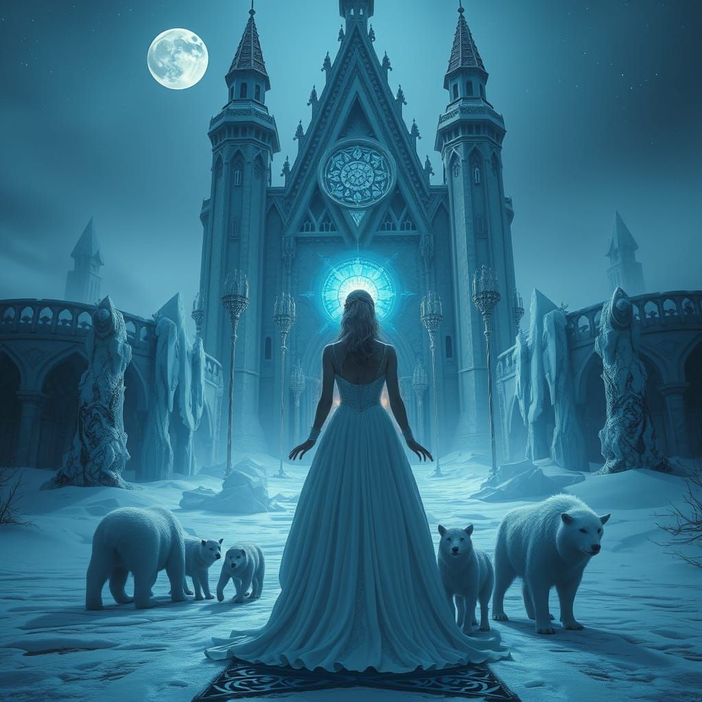 A mystical woman in a white gown stands before an icy castle, surrounded by polar creatures. The image blends fantasy and realism in an ethereal style with symbolic details.