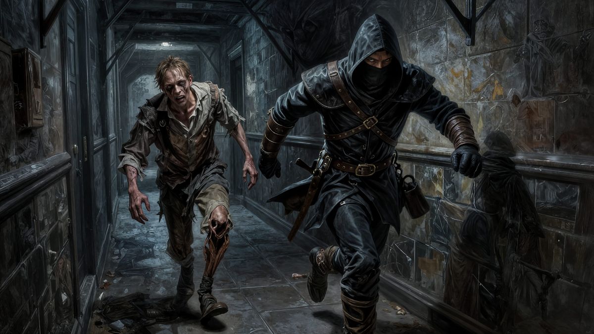 This image depicts a thief running from a zombie in a dark fantasy mental asylum. The scene is rendered as an acrylic painting with dynamic, cinematic action.