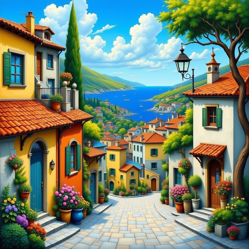 This image showcases a picturesque coastal village situated among rolling hills, featuring a blend of traditional architecture and dynamic artistic interpretation.