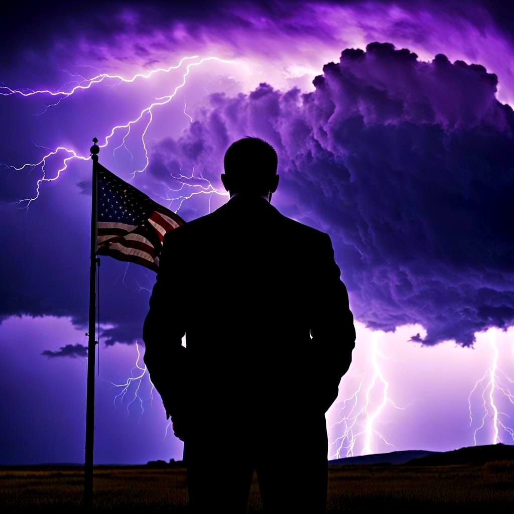 A dramatic black and white film noir image of a man standing alone, facing away from the camera, as a weathered American flag flails in the wind amidst a thunderstorm.