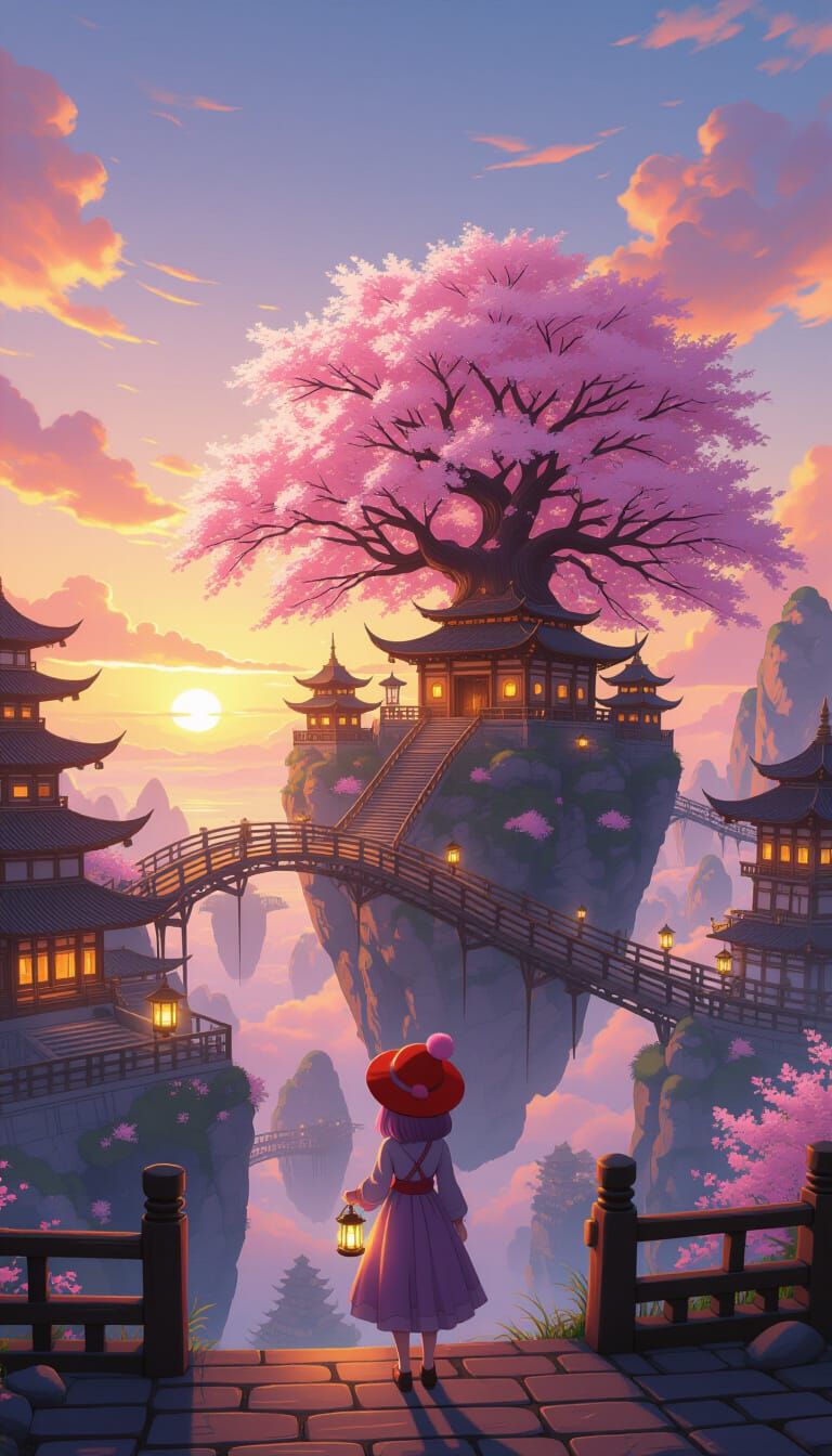 This image depicts a mystical fantasy realm with floating islands, ancient bridges, and oriental temples lit by golden lanterns. A giant pink cherry blossom tree and a girl with a magic lantern are featured.
