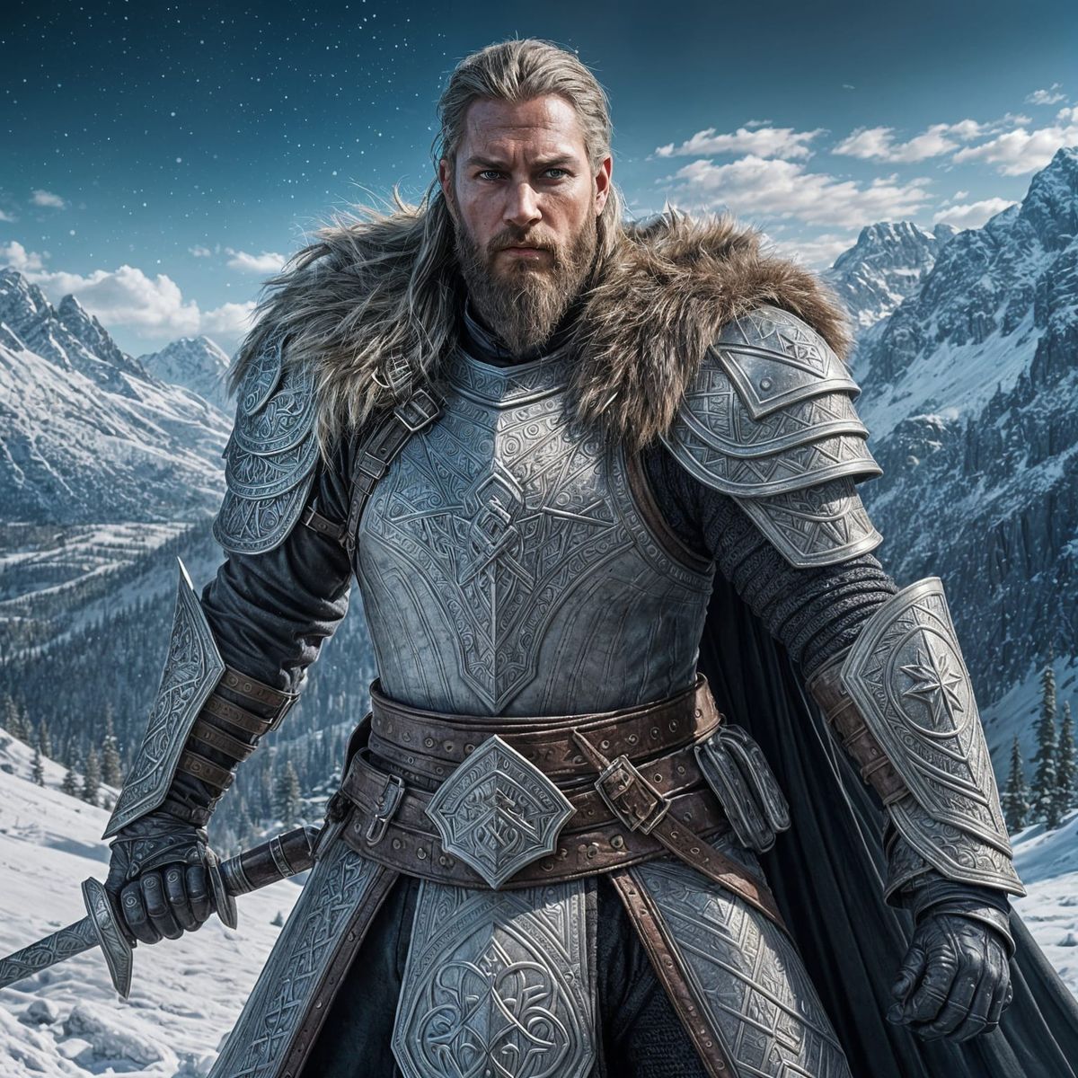 This image showcases an epic fantasy warrior in dark chainmail armor, striking a battle pose against a scenic winter backdrop. Rendered with high detail and dramatic lighting, it evokes a cinematic, high-quality concept art aesthetic.