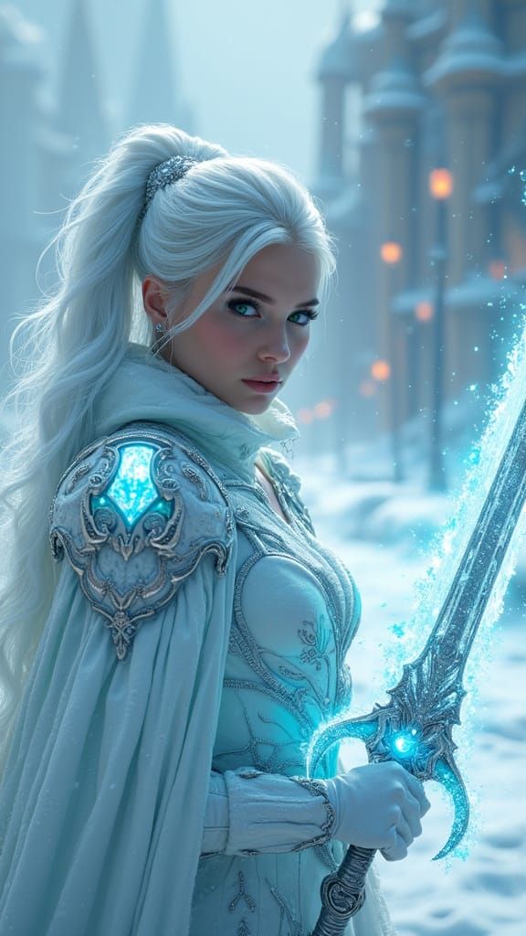 This image shows a powerful, futuristic warrior standing heroically in a snow-covered fantasy kingdom, clad in shimmering silver armor with neon accents and grasping an icy sword that radiates electric blue energy.