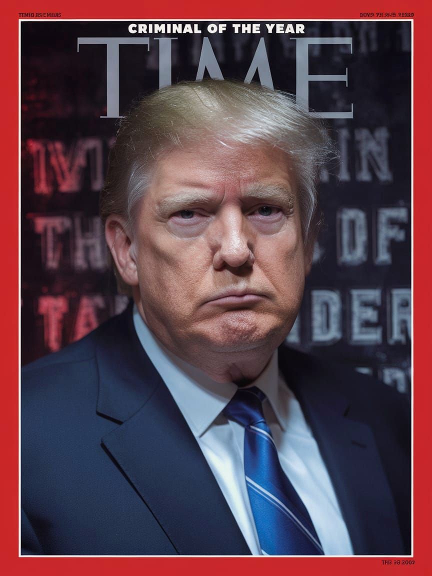 This image of a Time magazine cover depicts Donald Trump as the 'Criminal of the Year' in a dramatic lighting style reminiscent of Rembrandt. The dark background adds to the somber tone, highlighting the headline in bold text.