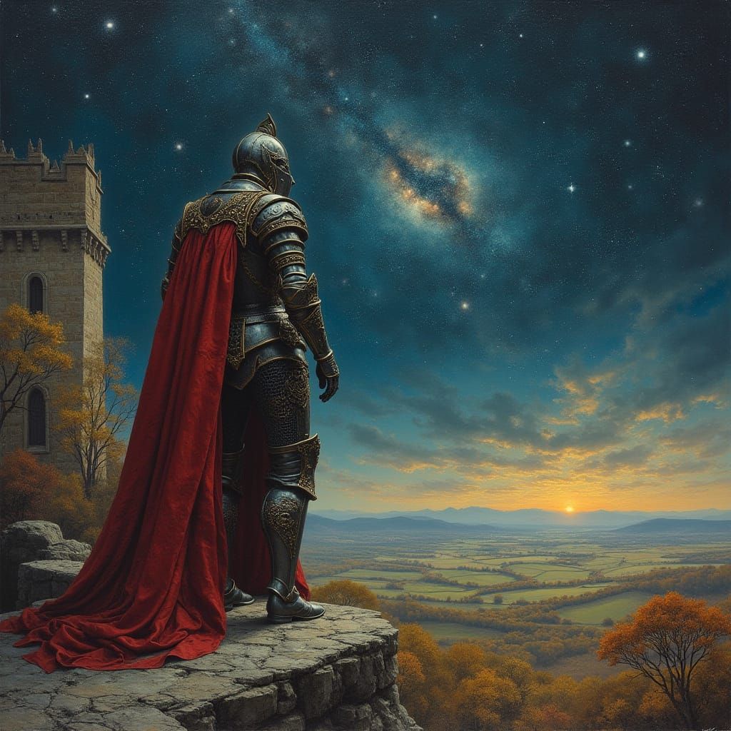 A striking picture of a knight in gothic armor guarding a crumbling parapet. The scene presents a panoramic autumnal landscape beneath a swirling, galactic night sky in a dark fantasy style.
