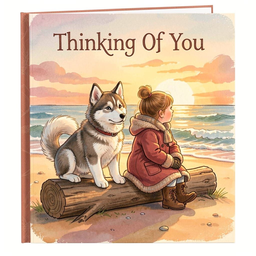 This charming illustration captures a husky puppy and a girl on a log by the sea, gazing at a sunset. Rendered in a cozy storybook style with warm colors and expressive brushstrokes.