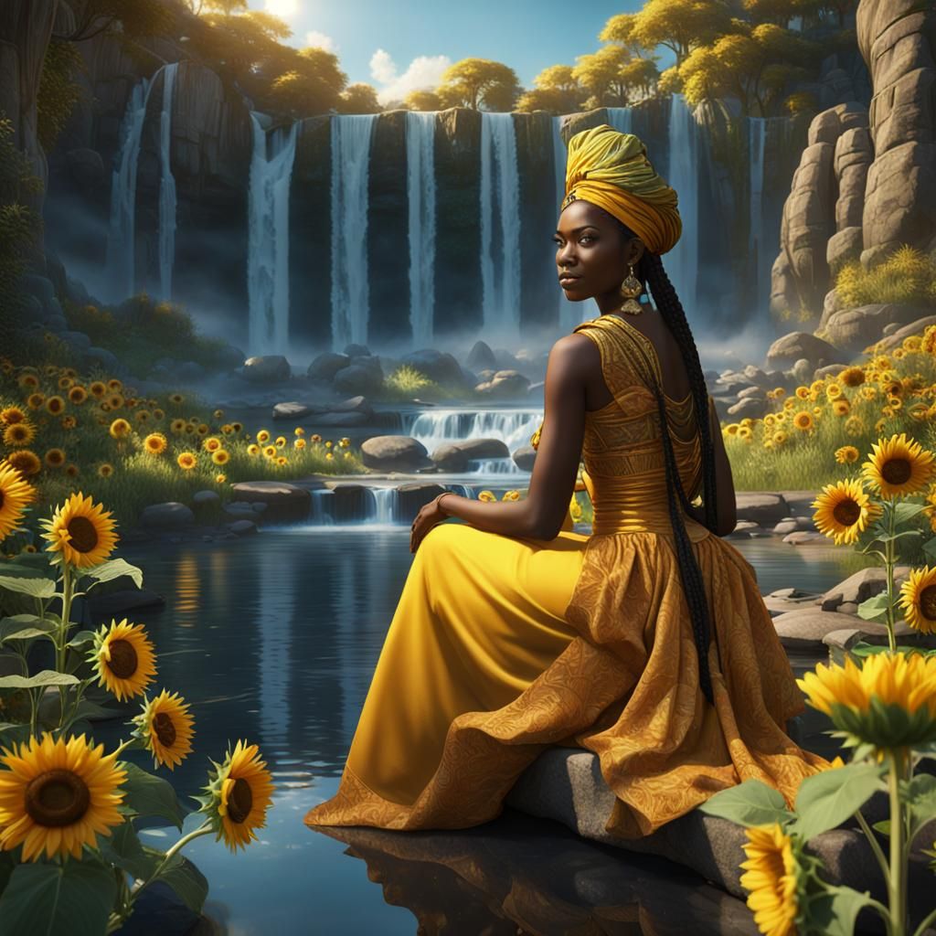 A striking picture of an African queen in a yellow dress gazing in a mirror by a river. Sunflowers surround her, with a waterfall in the background, in a fantasy concept art style.
