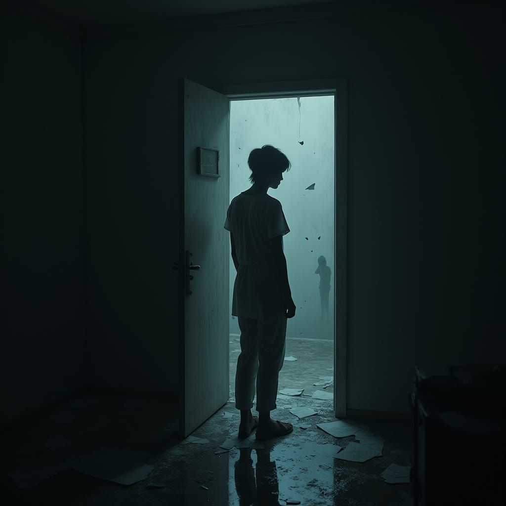 This haunting image depicts a person standing before a partially closed door, gazing at others in a dimly lit room, overcome by emotional burdens. Unseen chains emanate from their distorted faces, set amidst a backdrop of shattered mirror fragments. The artwork showcases intricate details, deep colors, a...