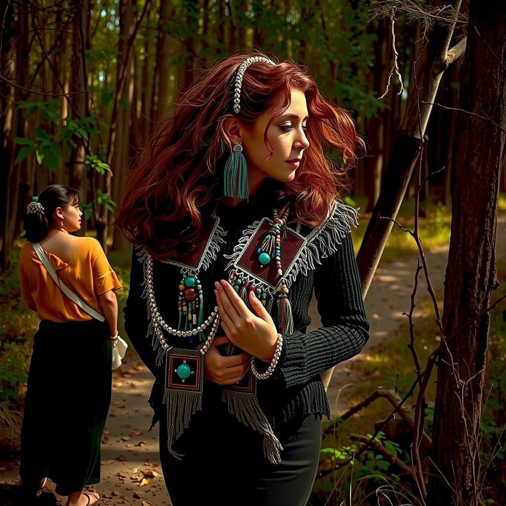 This image shows a woman with auburn hair walking through a forest at twilight. Sunlight filters through the trees, creating a play of light and shadow, rendered in photorealistic style.