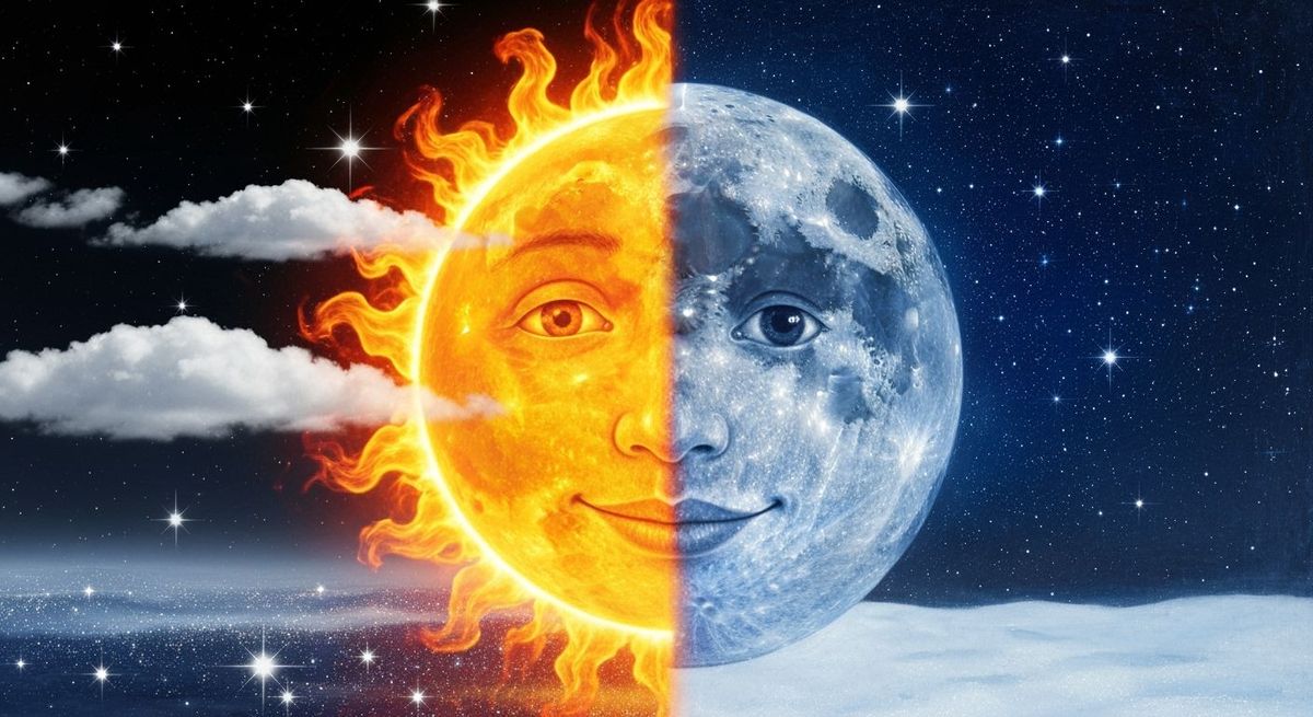This image shows a celestial body split in half between a blazing sun and an icy moon. The sun side features white clouds and a sparkling landscape, while the moon side shows stars in a deep blue sky. The artwork is reminiscent of surrealist art.
