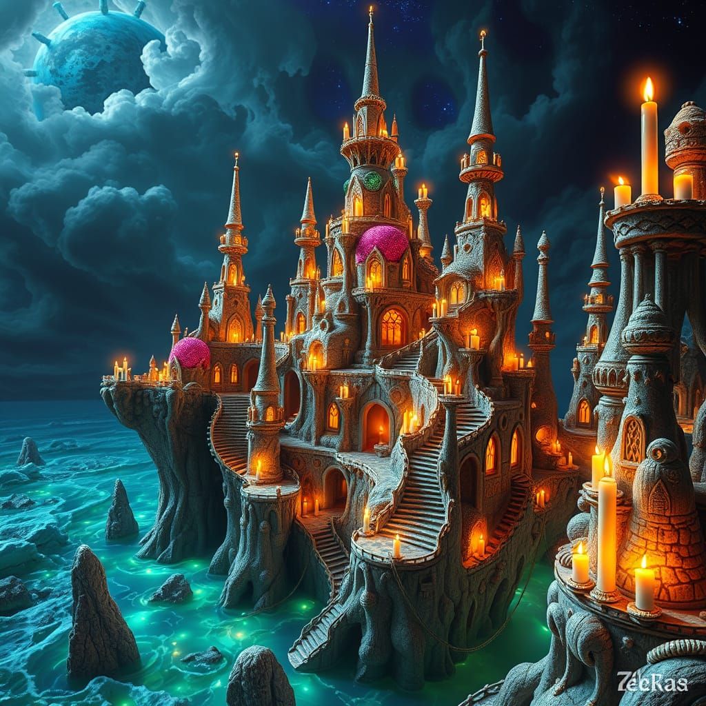 This image depicts twisted, psychedelic candle towers that evoke the surreal landscapes of Hieronymus Bosch, rising from the shores of a mystical island inspired by M.C. Escher's impossible geometry, amidst a dreamlike atmosphere of shimmering candlelight and iridescent glow, reminiscent of fantastical, ...