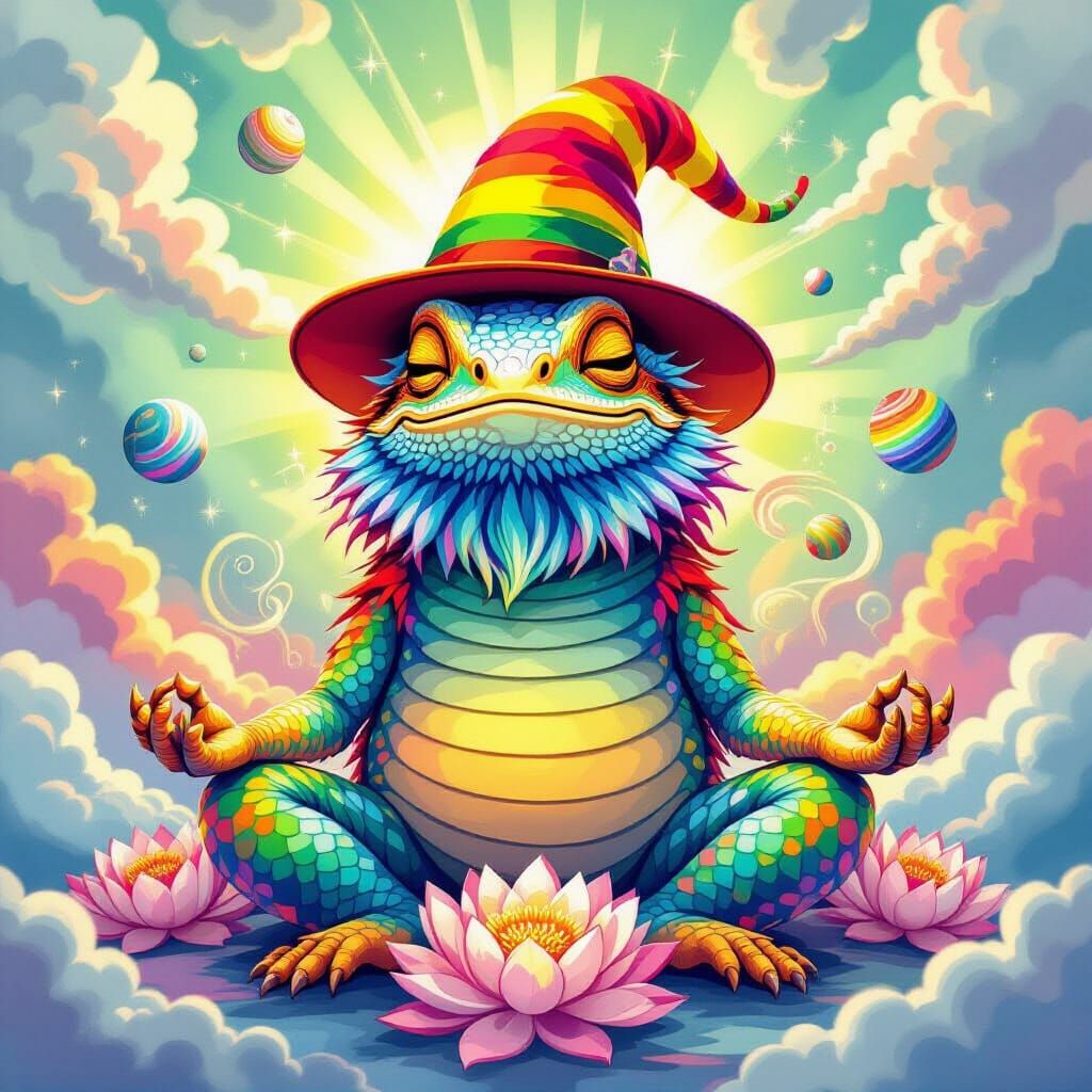 This image shows a bearded dragon wearing a Rasta hat, meditating peacefully amidst lotus flowers, planets, and rainbow smoke. The artwork showcases a psychedelic surrealism style with vibrant colors and soft watercolor textures.