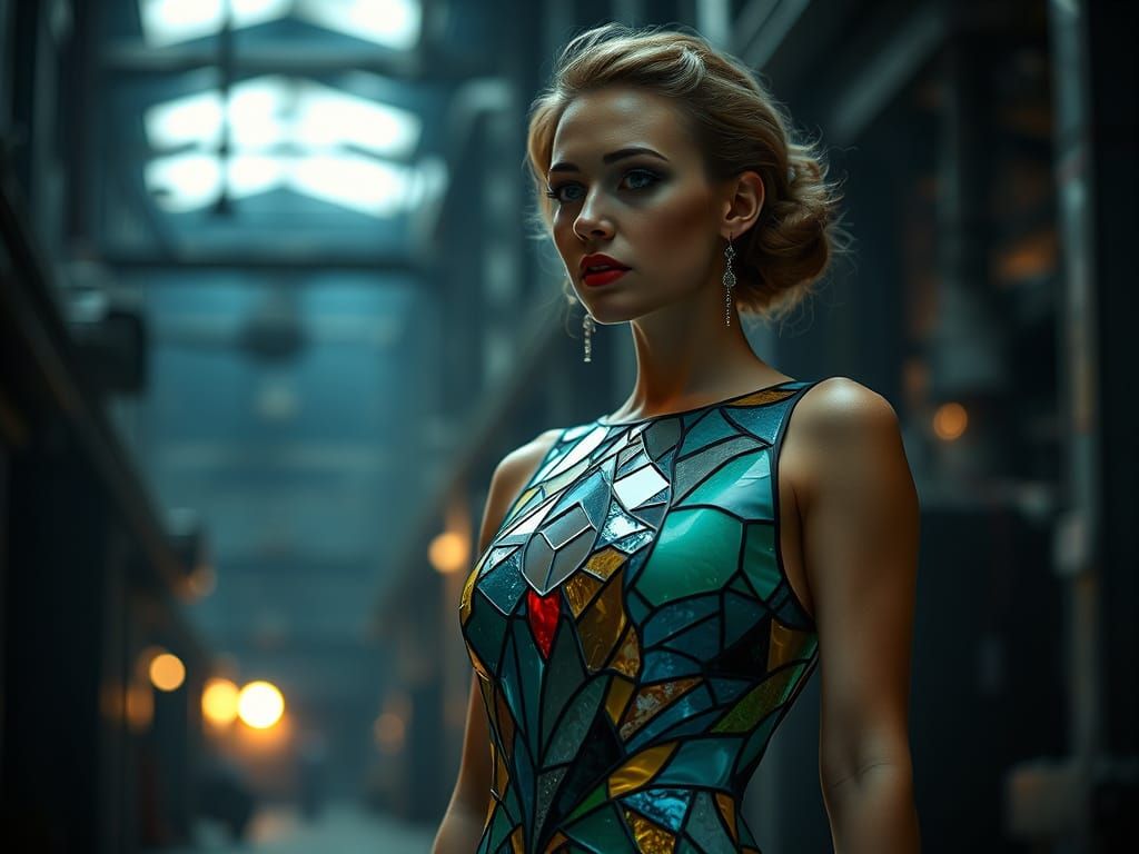 This image captures a medium shot of a woman in an art deco style, wearing a futuristic dress constructed from stained glass shards. She stands within a dark, menacing factory setting, with subtle inlays in her dress catching the dim light.