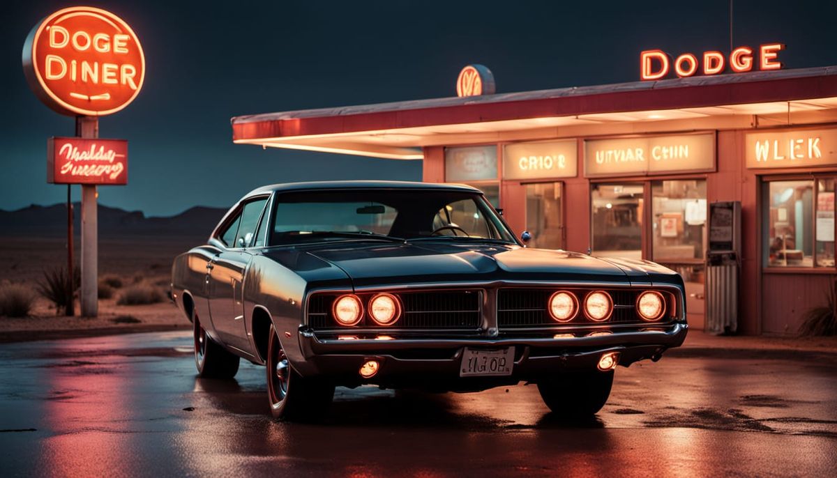 A 1969 Dodge Charger gleams under a neon diner sign on a wet Route 66 at midnight, capturing a nostalgic Americana atmosphere with cinematic lighting and sharp focus.
