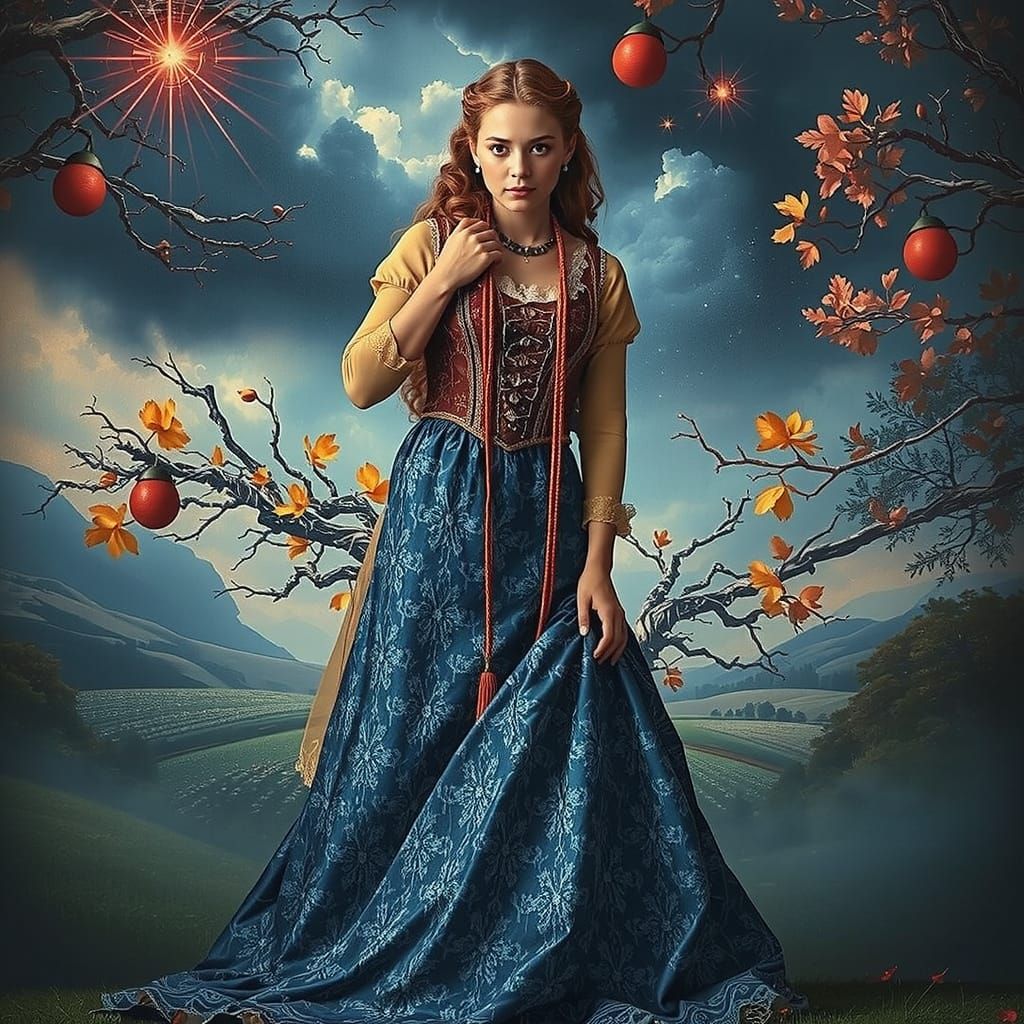 This image shows a figure in antique clothing with embroidery standing in a French countryside. Soft golden light and a subtle color palette enhance the photorealistic details.