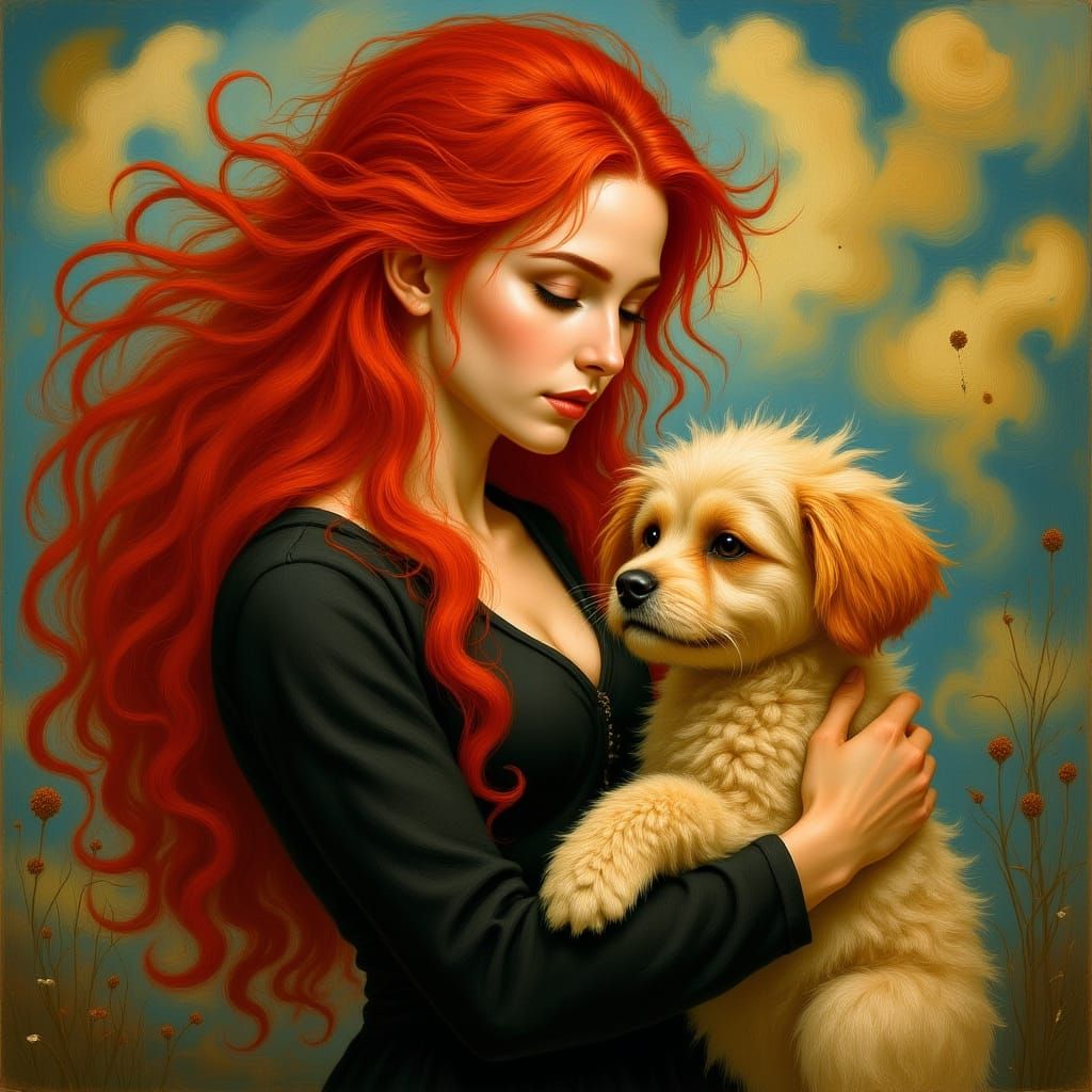 A digital painting of a woman with long red hair in an elegant outfit. The artwork showcases an art nouveau aesthetic with vibrant colors and subtle textures.
