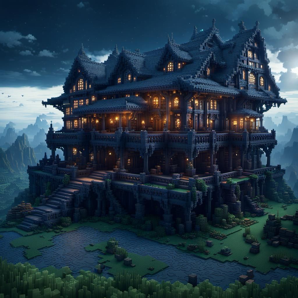 A stunning digital painting of an elaborate Minecraft house. The image features dramatic lighting and meticulous detail, creating a cinematic and atmospheric scene.