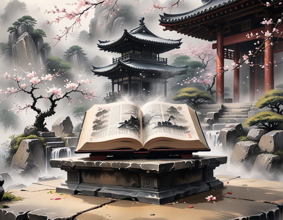 This image showcases an ancient tome on a stone pedestal in a misty temple courtyard, rendered in a serene Japanese ink wash style with falling cherry blossoms.