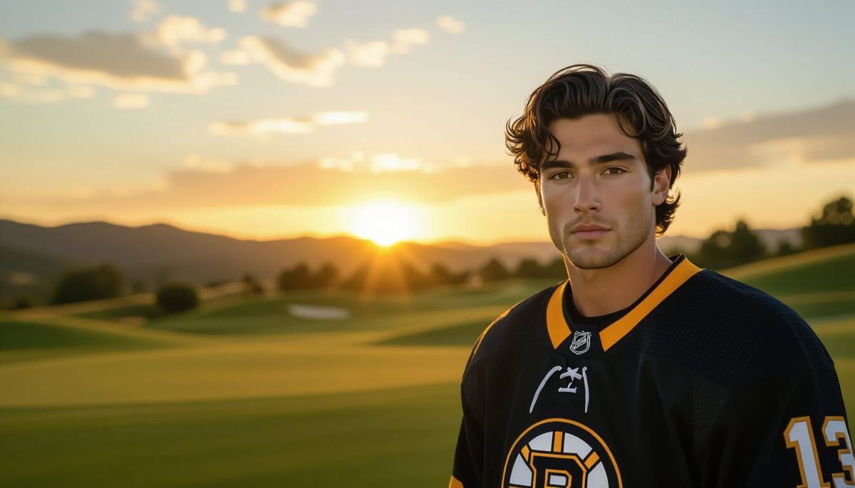 This image shows a handsome Italian man in a Boston Bruins jersey on a luxurious golf course. The cinematic lighting and sharp focus capture his confident, heroic stance as a modern knight in a sports setting.