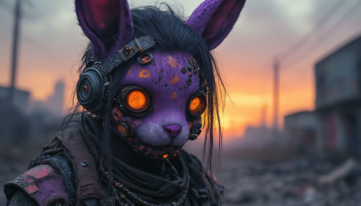 A striking picture of a full-body cyberpunk portrait in shades of orange and purple. The dark art style depicts a post-apocalyptic scavenger with intricate adornments, rendered in ultra-high definition.