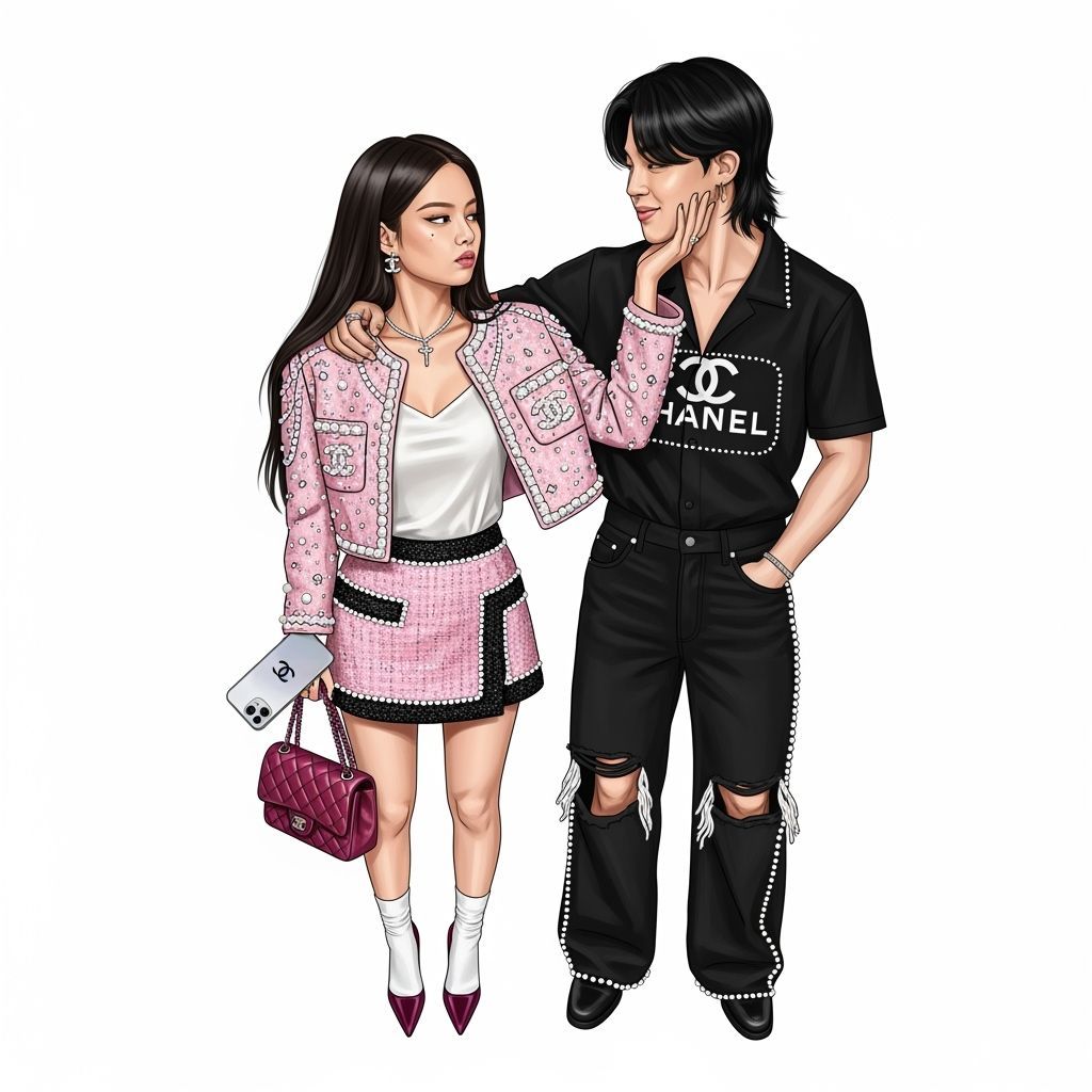 This image features K-pop stars Jennie and Jimin striking a pose together, dressed in high-fashion Chanel outfits. The realistic digital painting captures an intimate moment between the two global icons.