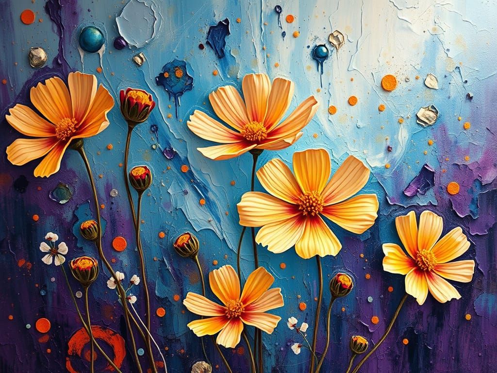 This striking oil painting captures the vibrant beauty of a cosmos bush in full bloom, rendered in a dynamic neo-impressionist style with thick, textured layers of paint. The artist's expressive brushstrokes evoke the intricate dance of wave function, with a palette of gold, blue, orange, and purple hues...