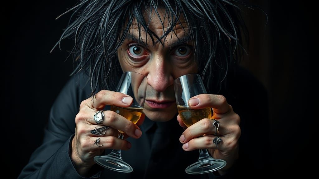 This image shows a photorealistic, grotesque creature in dark clothes, drinking champagne. It features cinematic lighting and a macabre, gothic aesthetic reminiscent of Tim Burton.