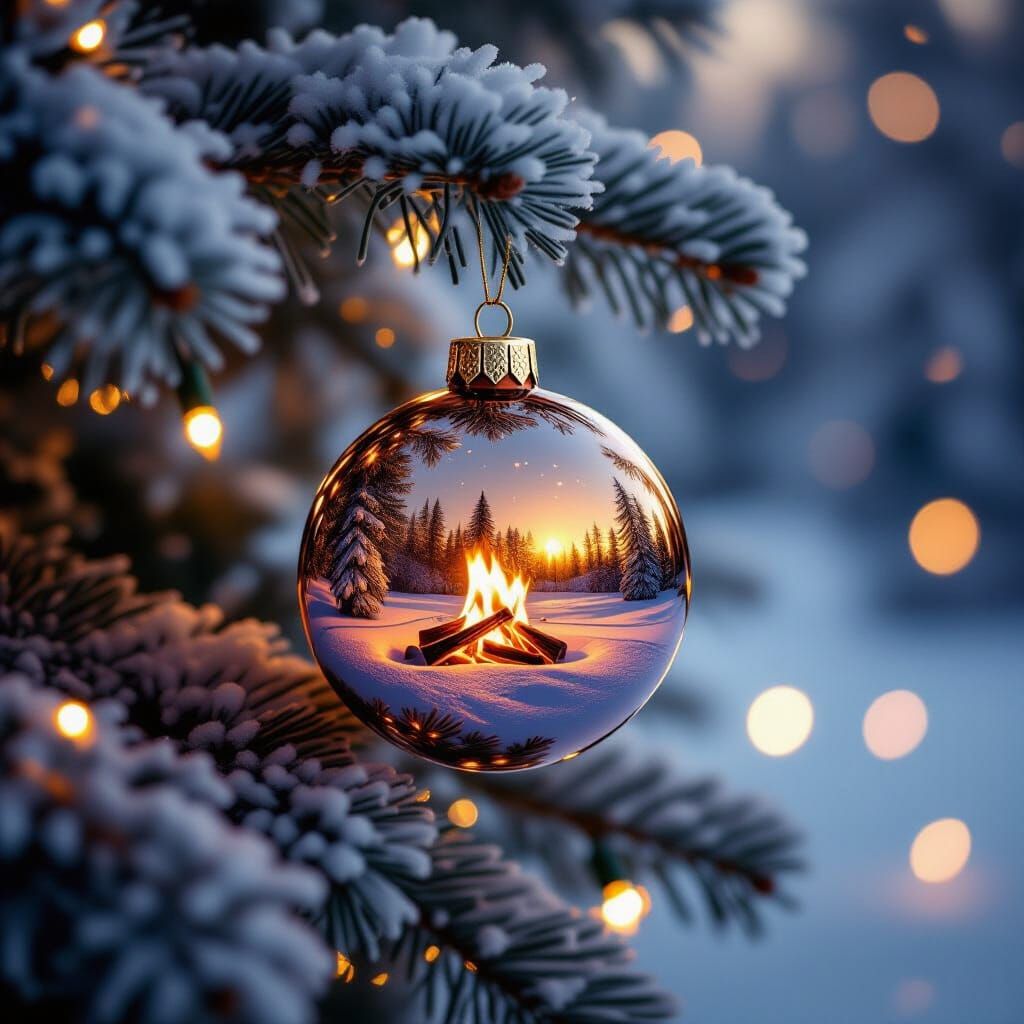 A hyper-realistic macro photograph of a single, shiny orange Christmas bauble on a frosted pine branch. The bauble reflects a distorted campfire scene, creating a magical holiday atmosphere.
