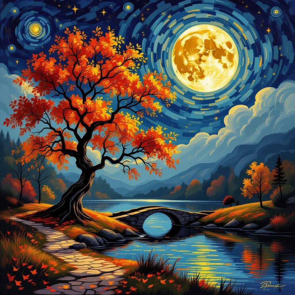 This digital painting captures an ancient oak tree in vibrant autumn colors, with thick, swirling brushstrokes. It features a full moon, star-filled sky, and a reflective lake.