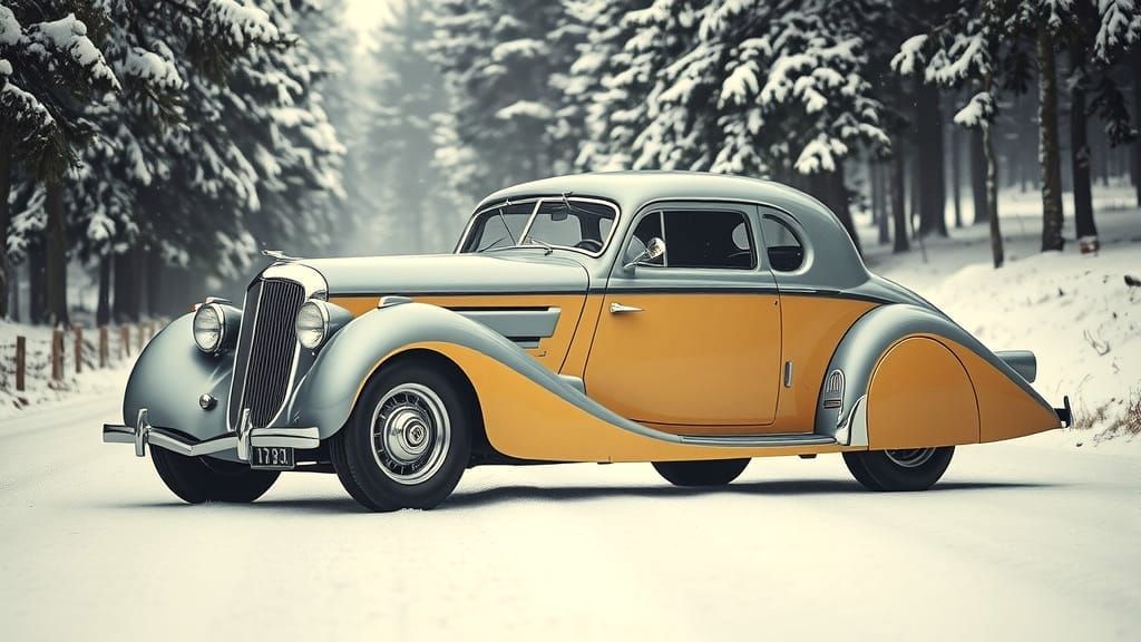 This image features a large, vintage French aerodynamic coupe in silver and yellow, parked on a snowy road. Rendered in a classic automotive photography style with cinematic stillness.