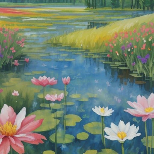 Easily generate your own naive pond and flower meadow images with our free AI art tool. Unleash your creativity!