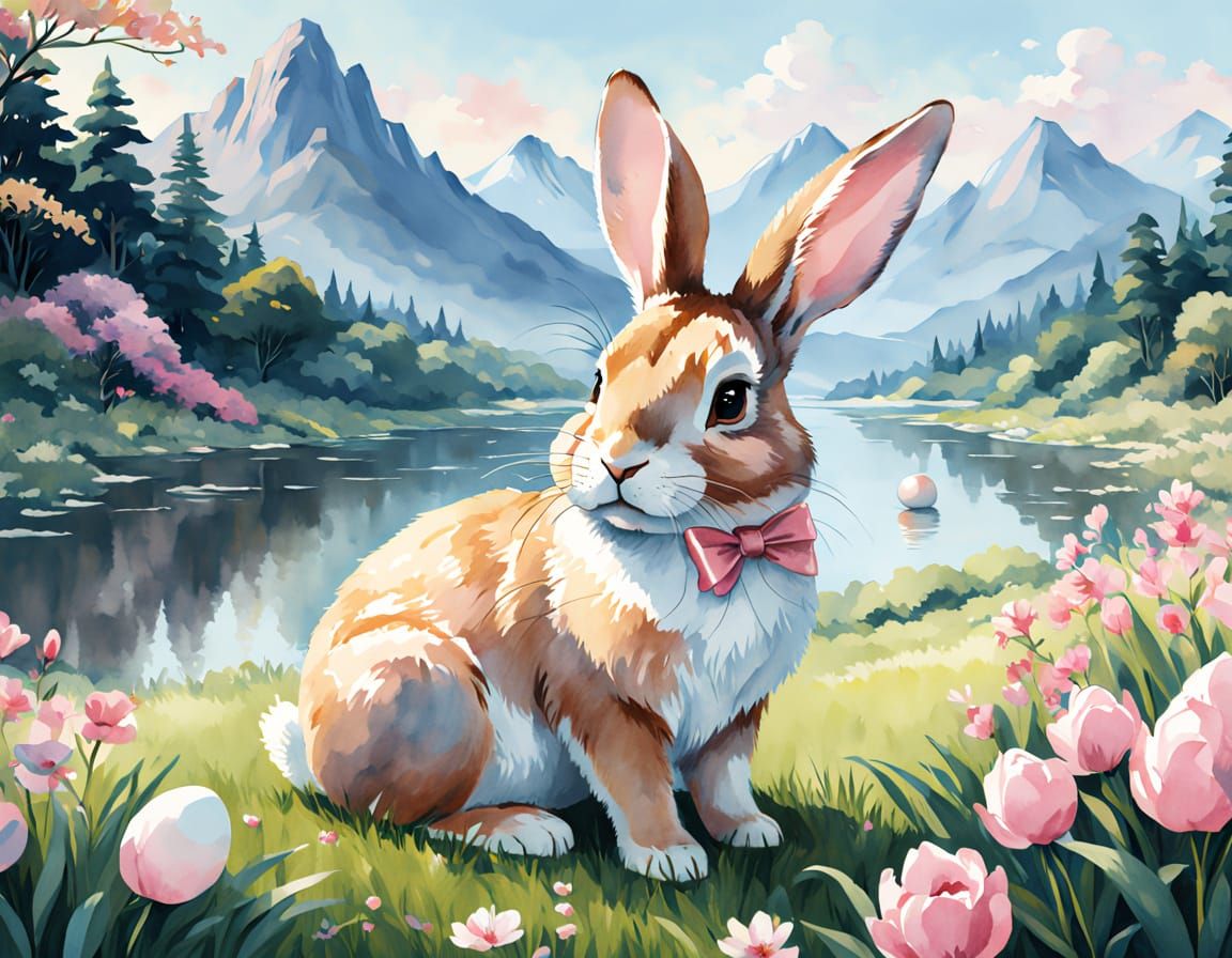 This image shows a watercolor illustration of a bunny wearing a pink bow and holding a decorated egg. The bunny sits in a field with a serene landscape background. The art uses soft pastel colors.
