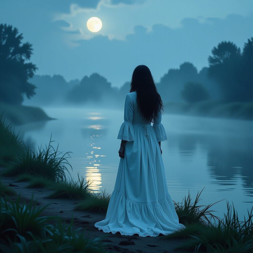 This image shows a ghostly figure in white standing by a river under the moonlight. The scene evokes a haunting atmosphere, rendered with deep shadows and an eerie glow, in the style of vintage photography.