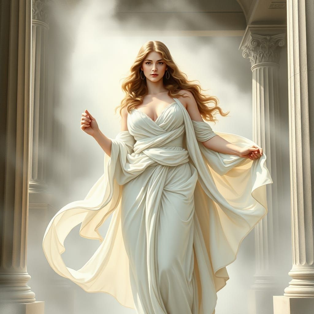 A monochrome watercolor of Aphrodite as a bank robber in ancient Greece. The image features soft pastel tones and ethereal light, reminiscent of Renaissance art.