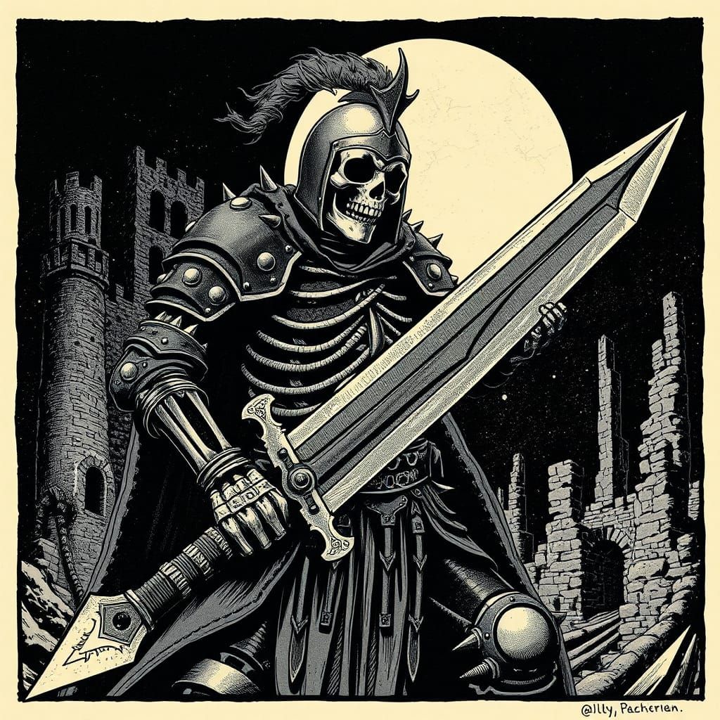 A striking picture of a skeleton knight in dark armor holding a large sword. The image uses bold lines and geometric shapes in a high-contrast linocut style with dark colors.