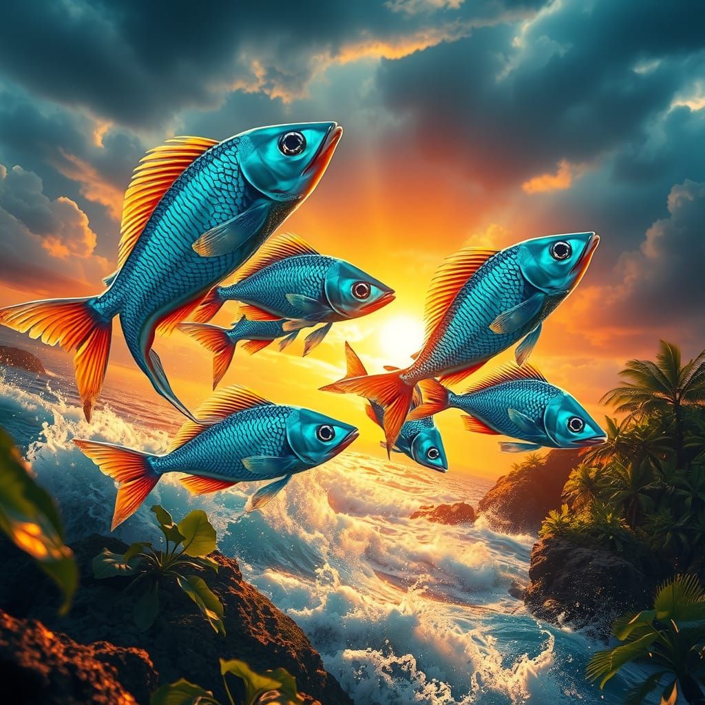This image captures a dynamic scene of Pisces fish leaping in unison amidst a turbulent storm on a lush tropical island, set against a kaleidoscope of colors and warm golden light, showcasing the majesty of the Pisces zodiac sign in hyperrealistic concept art style.